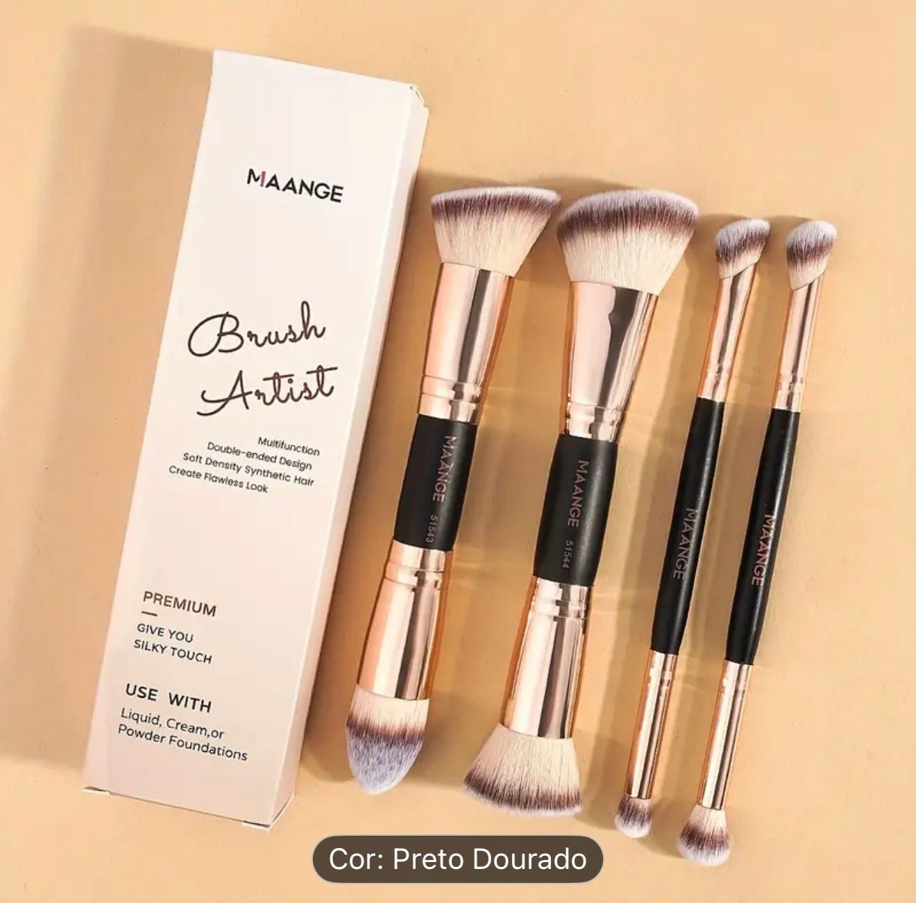 conjunto versátil de 4 pincéis de maquiagem de cabeça dupla, totalizando 8 pontas com funções distintas, ideais para uma maquiagem facial completa.
